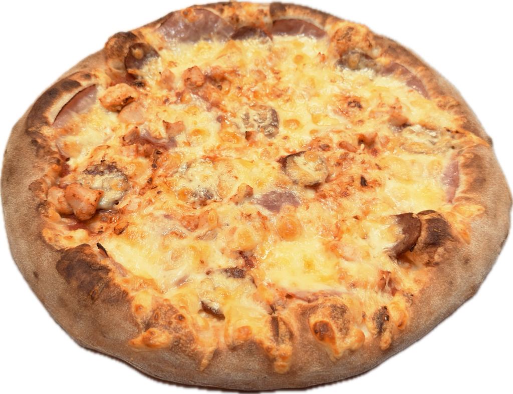 Aluat pizza, sos pomodoro, sunca, carnati, piept de pui, produs lactat